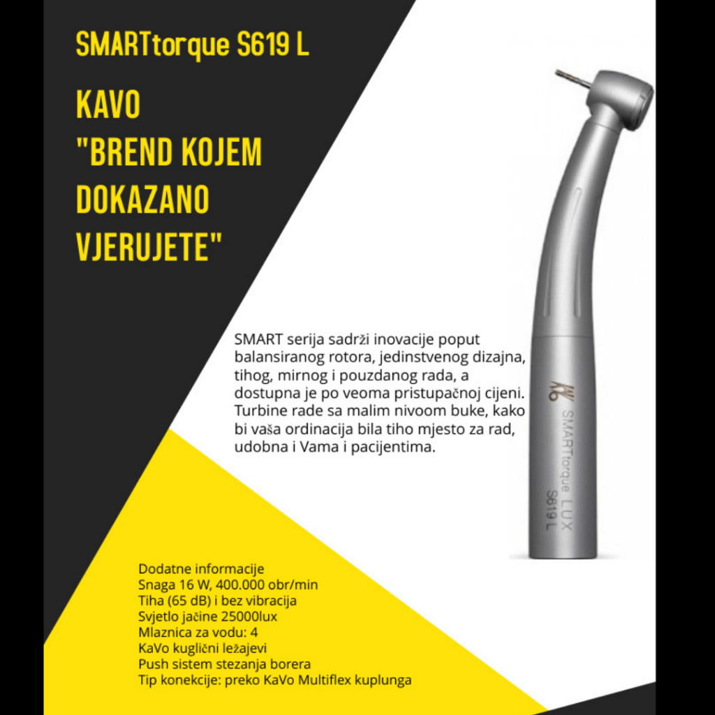 SMART serija sadržli inovacije poput balansiranog rotora, jedinstvenog dizajna, tihog, mirnog i pouzdanog rada, a dostupna je po veoma pristupacnoj cijeni. Turbine rade sa malim nivoom buke, kako bi vasa ordinacija bila tiho mjesto za rad, udobna i Varna i pacijentima.